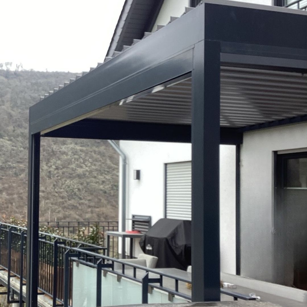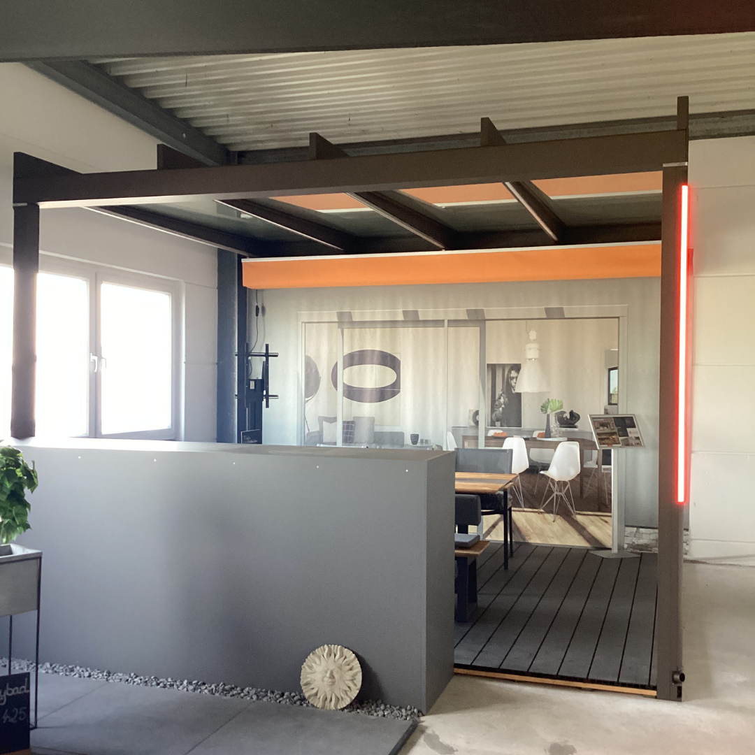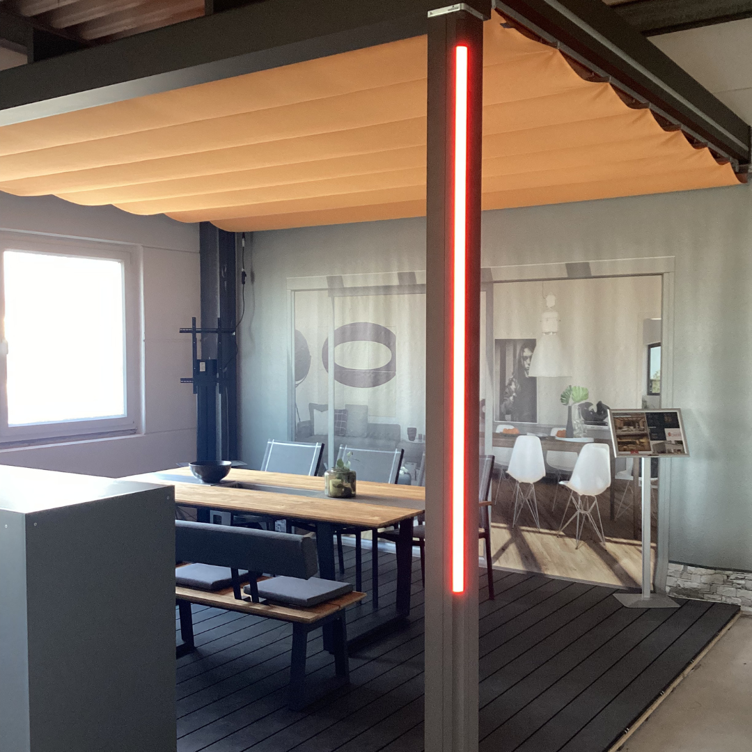 Das wunderschöne Glasdach ist der perfekte Wetterschutz für Ihr neues Outdoor-Wohnzimmer. In der Trendfarbe RAL 7016 fügt es sich in viele Außenbereiche perfekt ein. Details wie der integrierte Wasserablauf in einem der Stützpfosten machen dieses hochwertige Produkt aus. Dazu kommt die integrierte Beschattung unter dem Glasdach sowie die LED-Beleuchtung.